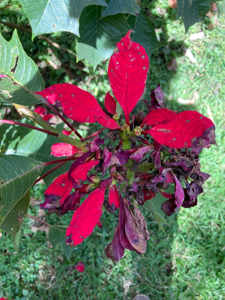 El rojo fue perdiendo viveza y las brácteas lozanía, y se han ido cayendo como si alguien las deshojara como pétalos de marchitas margaritas. Posiblemente el frío de la noche ayuda también a secarlas.