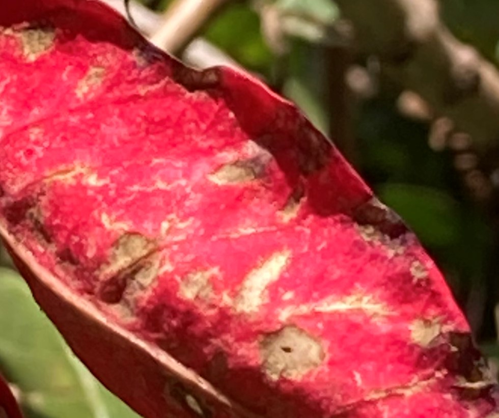 Dos semanas después llegó noviembre, y aún eran motivo de alegría. Pero, esplendorosas de lejos, al acercarnos a la planta, ya de tres metros de altura, notamos agujeros y mordiscos en algunas de sus hojas.