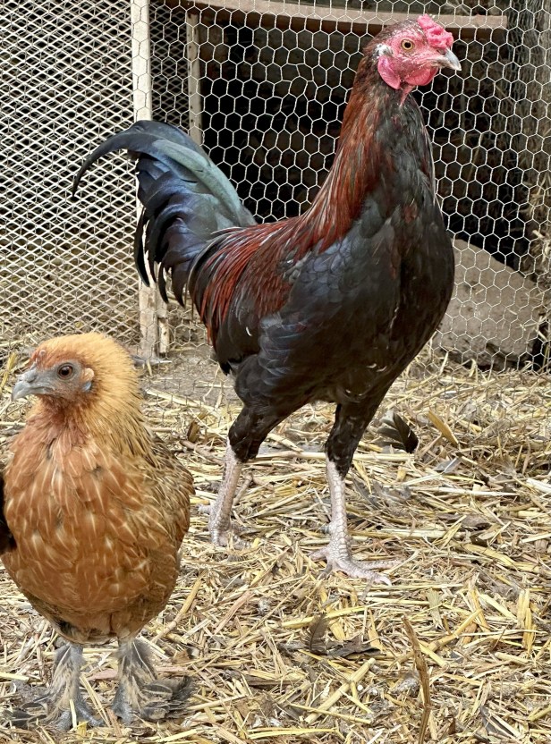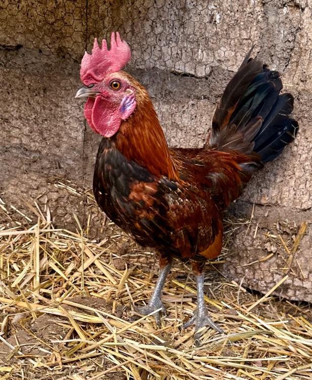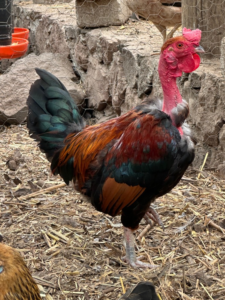 A quién le gusta este gallo tornasolado y zancón, de los preferidos en el campo porque crece alto y fuerte. Su color se asocia con la magia y las supersticiones: absorbe lo negativo, protege contra las malas vibras y dicen también que puede ser aliado de sabios y poderosos. Hay quien quiere muertos a los gallos negros. Yo los prefiero vivos y contentos.