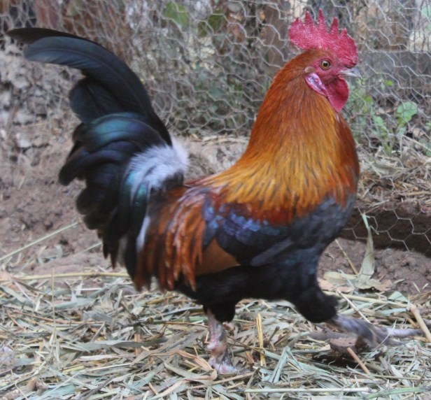 Un gallo bello de plumas brillantes y multicolores, amable con las gallinas, curioso con los pollitos, precavido, vigilante y activo.