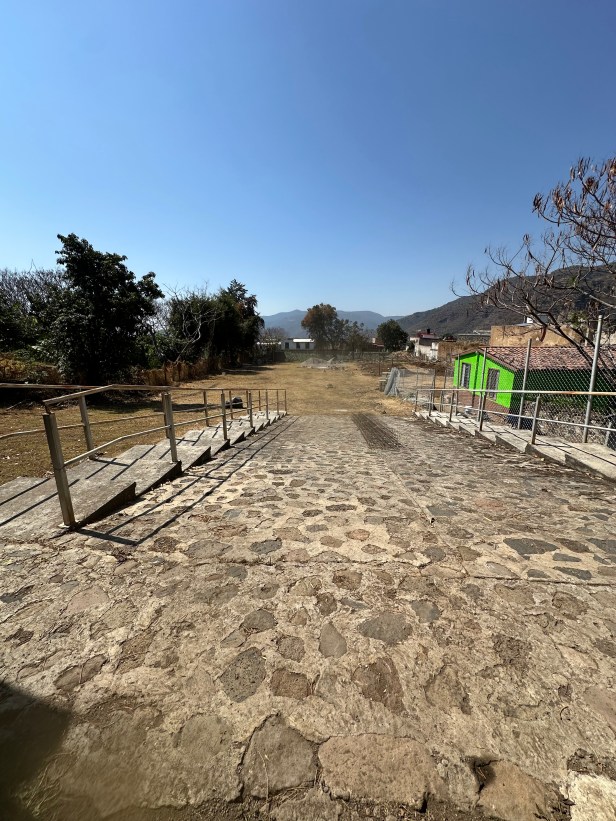 Del huerto del convento de Malinalco queda una superficie de unos 12 mil m2, donde de unos años para acá han construido unos baños públicos con su jardín de pasto y una larga y ancha rampa de piedra rehogada. Del lado izquierdo se ve un conjunto de árboles y plantas que es un pequeño huerto biodiverso, y al fondo hay un sembradío de maguey mezcalero.